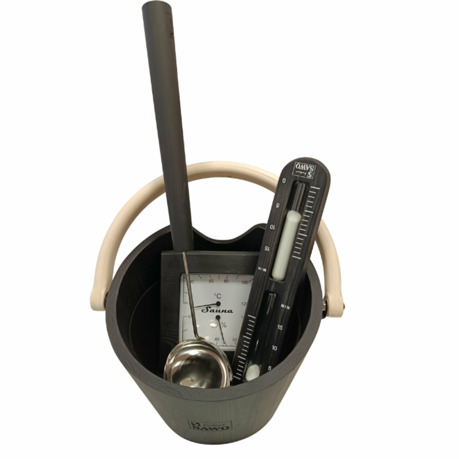 The set includes a bucket with ladle, a combined thermometer and hygrometer, and a sauna hourglass.