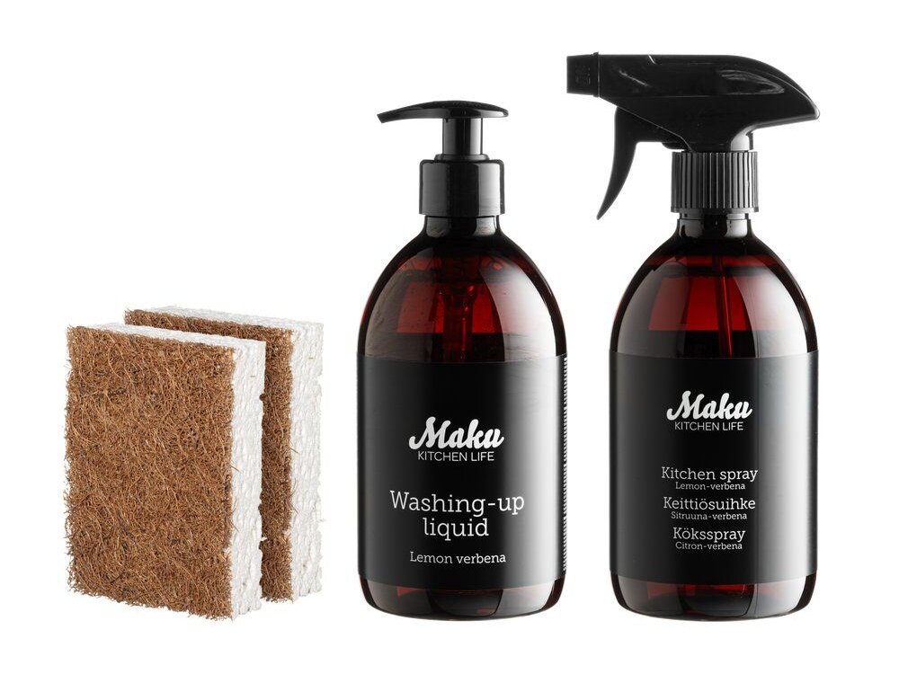 The Maku Kitchen Life Dishwashing Gift Set is a practical and stylish addition to any kitchen. The set includes lemon verbena washing-up liquid (500 ml), lemon verbena kitchen spray (500 ml), and 2 cleaning sponges.