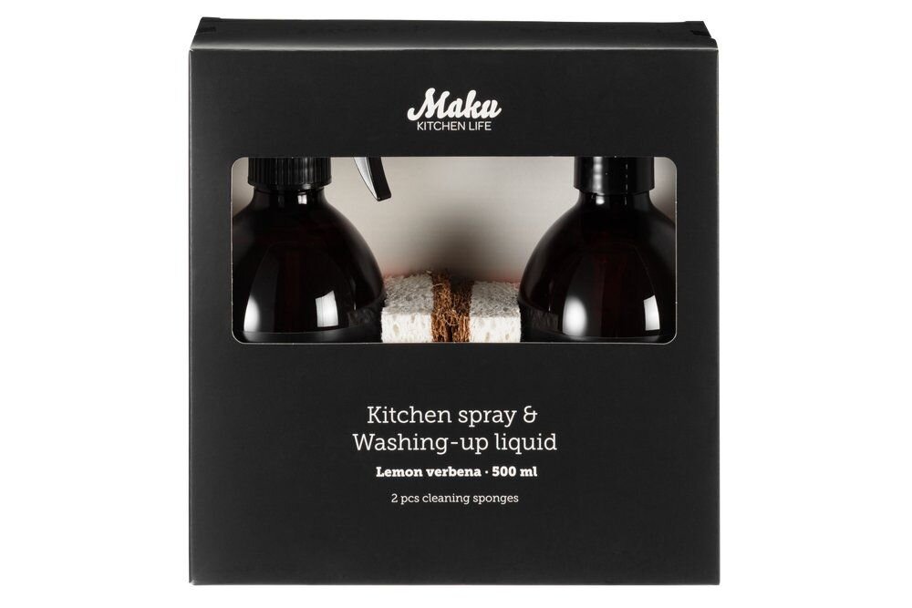 The Maku Kitchen Life Dishwashing Gift Set is a practical and stylish addition to any kitchen. The set includes lemon verbena washing-up liquid (500 ml), lemon verbena kitchen spray (500 ml), and 2 cleaning sponges.