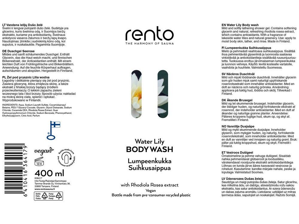 Enjoy gentle and refreshing care after the sauna, in the shower, or anytime during the day. Rento Water Lily body wash, with the delicate scent of water lily and fresh flowers, thoroughly cleanses the skin, hydrates it, and leaves it feeling smooth and refreshed. Its mild formula is gentle on the skin and suitable for everyday use.