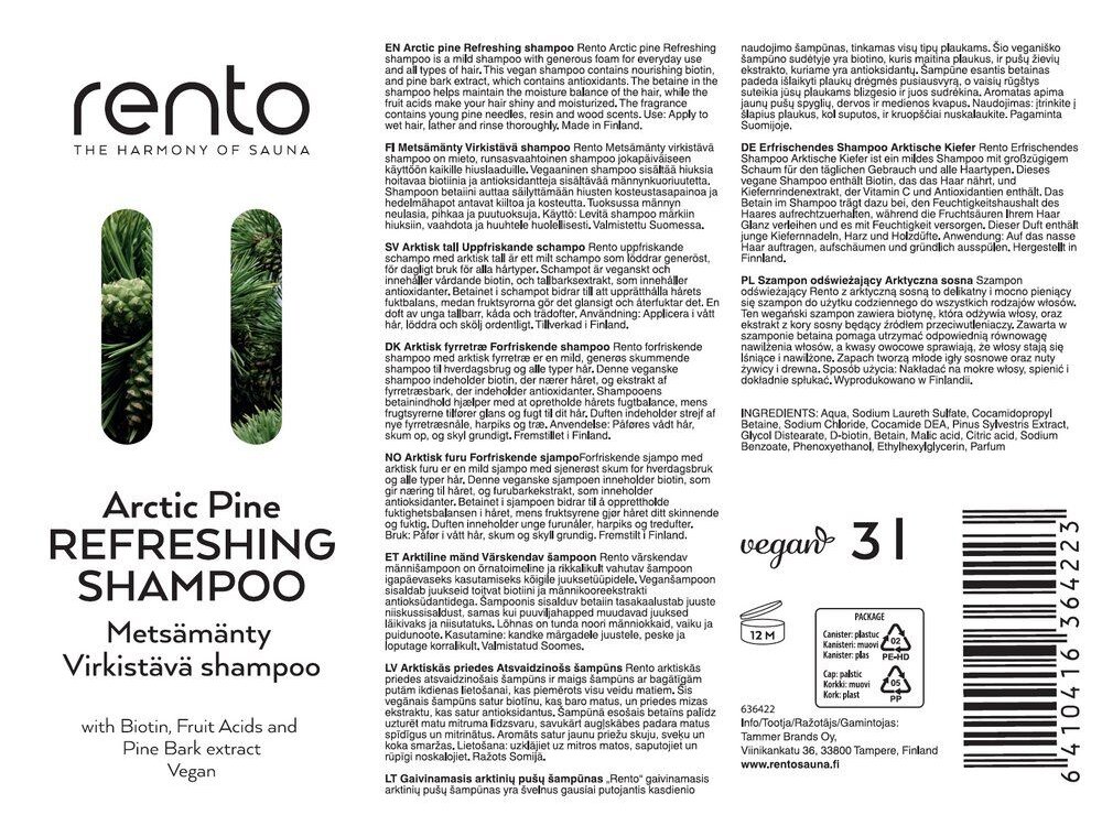 Give your hair and scalp refreshing care inspired by Finnish nature. Rento Arctic Pine shampoo gently cleanses, hydrates and leaves hair naturally soft and easy to manage. Thanks to its gentle formula, it is suitable for all hair types and for regular use after sauna or showering.